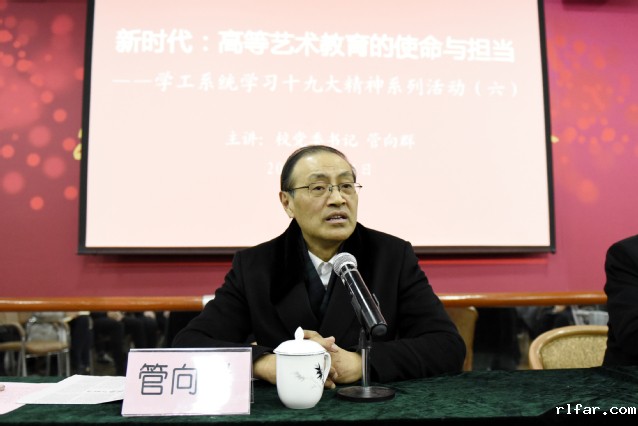 2018年1月11日下午2:30,学工系统在教工之家组织了学习十九大精神系列的第六次活动,邀请校党委书记管向群做了题为“新时代:高等艺术教育的使命与担当”的报告。此次活动由校党委常委、副院长俞锋主持,相关职能部门工作人员、各二级学院辅导员以及学生代表参加了学习。