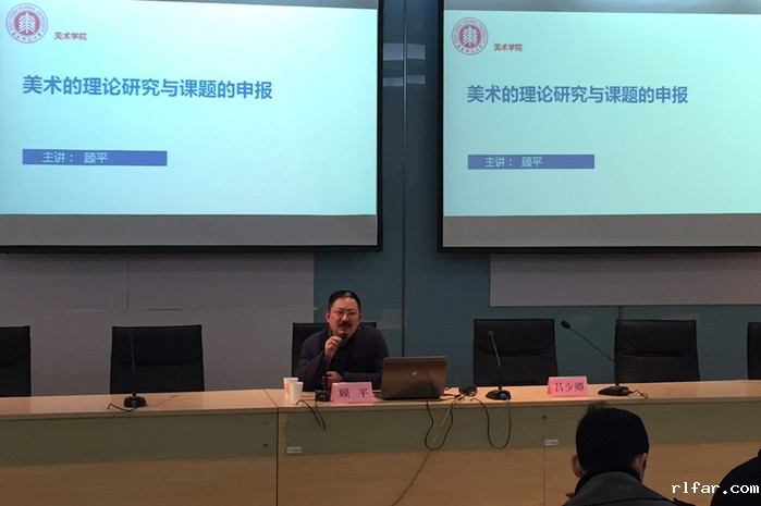 顾平教授首先对美术的理论研究的相关理念和要素作了详细的阐述,随后对科研课题的分类来源,特别是课题申报的一般流程到具体的申报课题项目方案撰写的注意事项,均作了详尽的讲解,提出了一系列独到的学术研究方式方法。