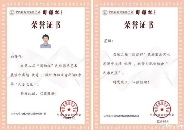 在中国民族管弦乐学会主办的第二届“国韵杯”民族器乐艺术展演中被评为最高奖——职业青年B组古筝“民乐之星”及职业组合“民乐之星”。