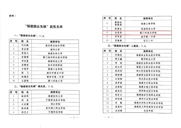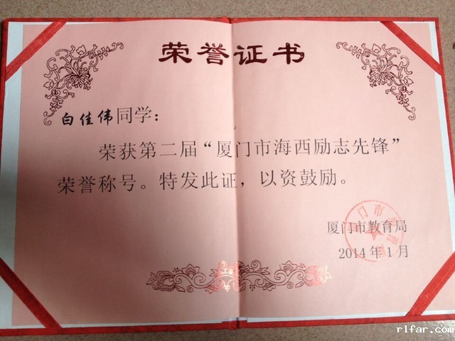 他曾被福建省教育厅等16个部门评选为“福建励志先锋”,受到江苏电视台、福建教育电视台、厦门日报等多家媒体宣传报道,并荣获由厦门市教育局举办的第二届“厦门市海西励志先锋”奖(排名第一)。