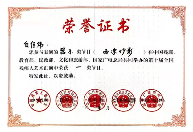 白佳伟曾在由中国残联、教育部、民政部、文化和旅游部、国家广电总局共同举办的第十届全国残疾人艺术汇演中荣获全国一类节目。