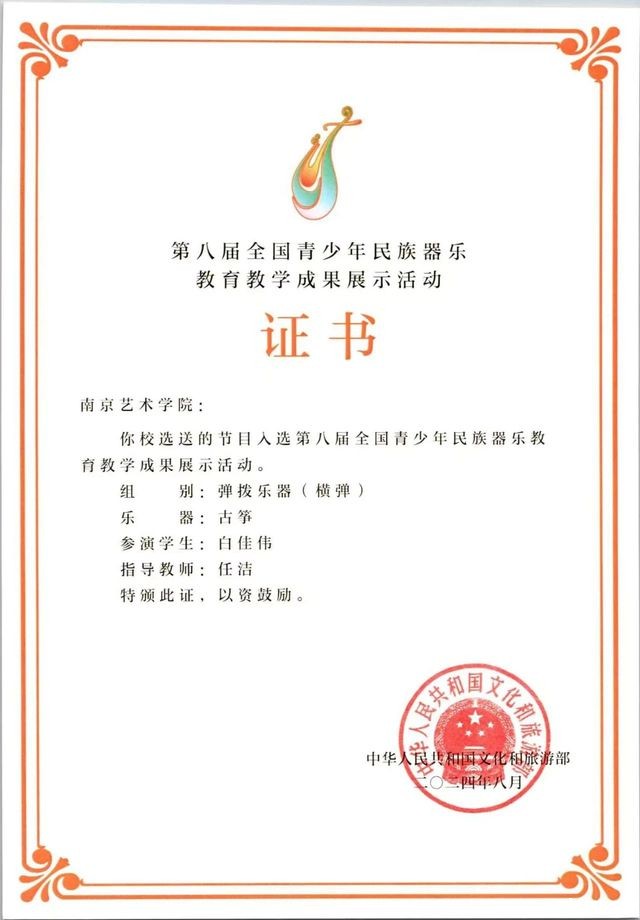 入选文化和旅游部主办的第八届全国青少年民族器乐教育教学成果展示活动。