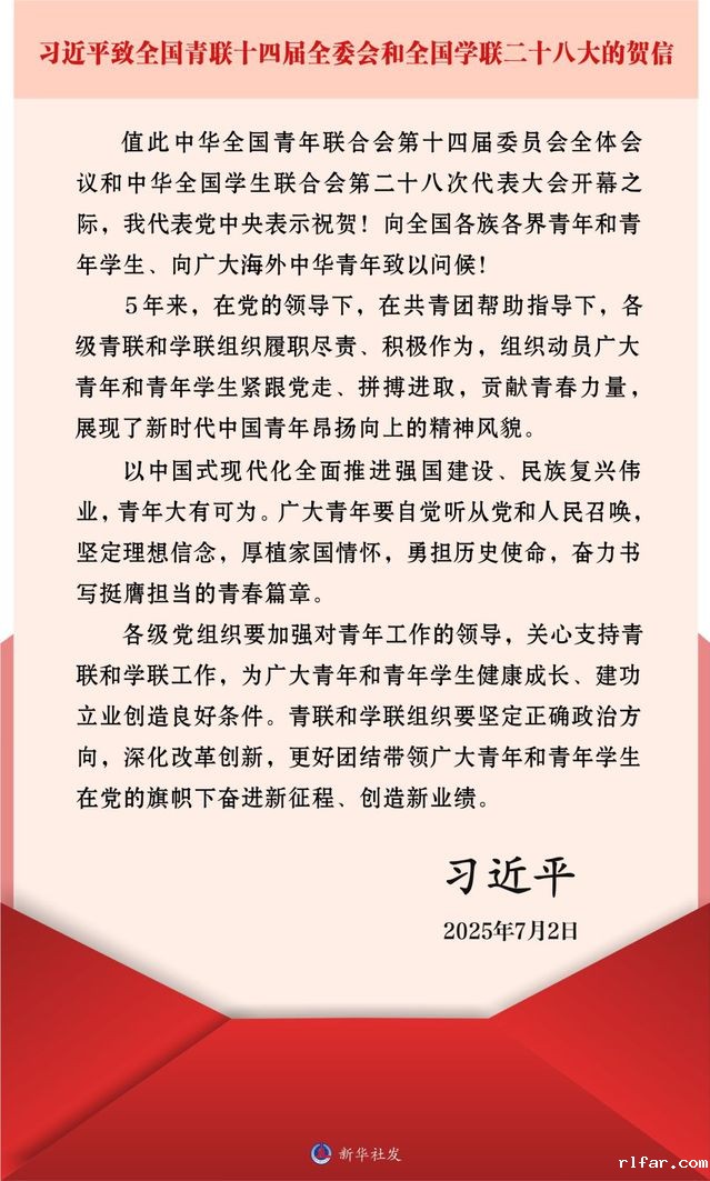 7月2日至7月3日,中华全国青年联合会第十四届委员会全体会议、中华全国学生联合会第二十八次代表大会在北京召开。中共中央总书记、国家主席、中央军委主席习近平发来贺信,代表党中央对大会的召开表示祝贺,向全国各族各界青年和青年学生、向广大海外中华青年致以问候,并提出殷切希望。
