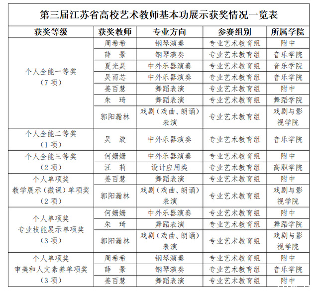近日,省教育厅办公室发布《关于公布第三届江苏省高校艺术教师基本功展示获奖结果的通知》,我校教师团队在本届展示中表现不俗,斩获18个奖项,取得三届活动以来的最好成绩。其中个人全能奖10项,包括一等奖7项,二等奖1项,三等奖2项;个人单项奖8项,包括教学展示(微课)2项、专业技能展示3项、审美与人文素养展示3项。