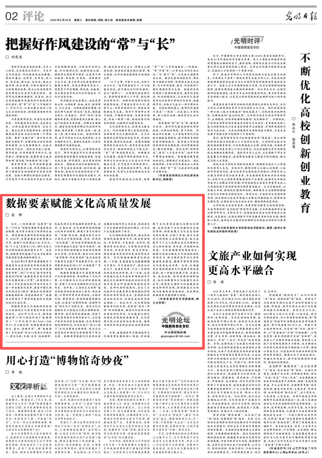 当前,数据要素作为驱动数字文化高质量发展的核心动能,有效破解了文化资源分散化与静态化难题,成功突破了文化传播时空区域性限制,持续拓展了文化业态创新同质化困局,打破了市场、技术与资源之间的孤立或割裂状态,极大地提升了广大人民群众在文化精神生活上的体验感、参与感、幸福感和成就感。文化数据要素的乘数效应,能够从深层次激发文化体制机制改革的活力,助力国家数字文化资源基础体系建设,推动中华优秀传统文化更好走向世界。未来,应构建更加高效畅通的文化数据市场流通机制,进一步健全数据产权、流通交易、收益分配、协同治理和保障制度,切实加强国际文化数据交流与合作,持续参与国际文化数据标准制定和科学治理,持续推进文化领域与数据要素深度融合,充分释放数据要素内蕴的强大动能。
