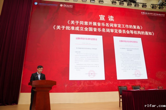全国科学技术名词审定委员会事务中心副主任张晖宣读《关于同意开展音乐名词审定工作的复函》及《关于批准成立全国音乐名词审定委员会等机构的通知》,确认授权中国音乐学院为全国音乐名词审定委员会秘书处单位,在全国科技名词委的指导下开展我国音乐名词审定工作,并批准成立全国音乐名词审定委员会及分委员会、全国音乐名词编写委员会及分委员会。