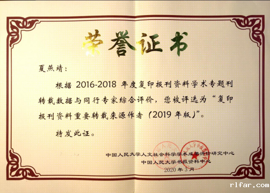 近日,研究院夏燕靖教授收到中国人民大学人文社会科学学术成果评价研究中心、中国人民大学书报资料中心发来的荣誉证书,根据2016-2018年度人大复印报刊资料学术专题刊载数据与同行专家综合评价,被评选为人大“复印报刊资料重要转载来源作者(2019年版)”本次入选的重要转载来源作者,“艺术学”学科共计32人,涉及25个高校院所。